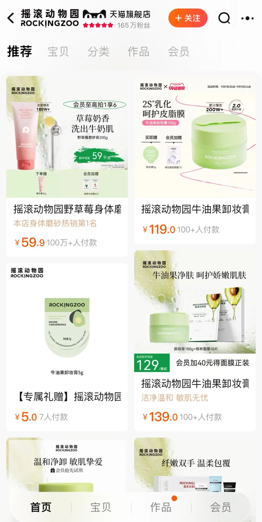 截至目前,摇滚动物园天猫旗舰店粉丝数为165万,产品价格在4.95元-300.9元之间,品类包括个护及护肤类产品。其中,售价在59.9元-109.8元之间的野草莓身体磨砂膏销量最高,付款人数超100万;另有一款售价在89元-169元间的牛油果卸妆膏,付款人数也超70万。