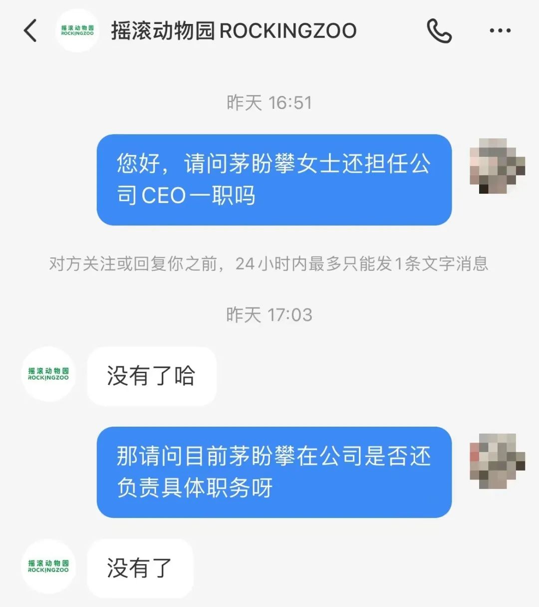 上述一系列变更表明,茅盼攀在摇滚动物园关联公司中仅剩于少量股权,已不再担任法定代表人、董事长兼总经理等重要职务。就此,青眼多次致电茅盼攀本人进行求证,但截至发稿,电话一直无人接听。