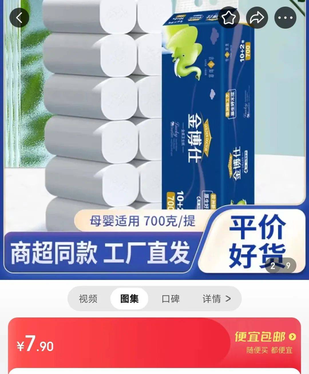 “金博仕”的原生木浆卷纸,品质和某一知名品牌持平,但比后者售价低了20-30%,其中最低的一款价格仅为7.9元。