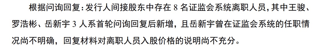 界面新闻查询发现,得一微在招股说明书中已经提到5名证监会系统离职人员持股情况;此外,上交所在第二轮问询中也指出,发行人间接股东中存在8名证监会系统离职人员,有3人系首轮问询回复后新增。