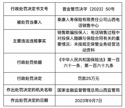 9月13日,国家金融监督管理总局山西监管局行政处罚信息公开表显示,2023年9月7日,泰康人寿保险有限责任公司山西电话销售中心被处罚款25万元,主要违法违规事实为:销售欺骗投保人;电话销售过程中对投保人隐瞒与保险合同有关的重要情况;未按规定保管业务经营活动资料。