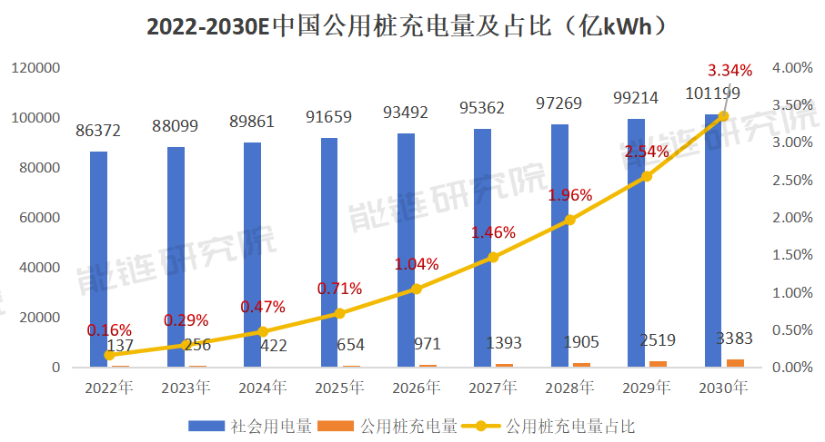 根据能链研究院的数据,2022年,国内新能源汽车保有量1310万辆,公用充电桩的充电量是137亿度,占全社会用电量的0.16%,预计到2030年,国内新能源汽车保有量将突破1.45亿辆,公用充电量会达到史无前例的3380亿度,充电量增长25倍,占社会用电量将达到3.34%。