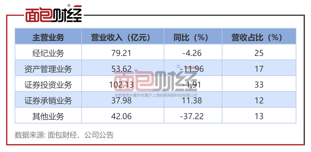 中信证券的主营业务中,证券承销业务同比增长,但经纪业务、资产管理业务、证券投资业务和其他业务均有下降。其中,其他业务收入和资产管理业务收入下降较为明显,分别较上年同期下降37.22%和11.96%。