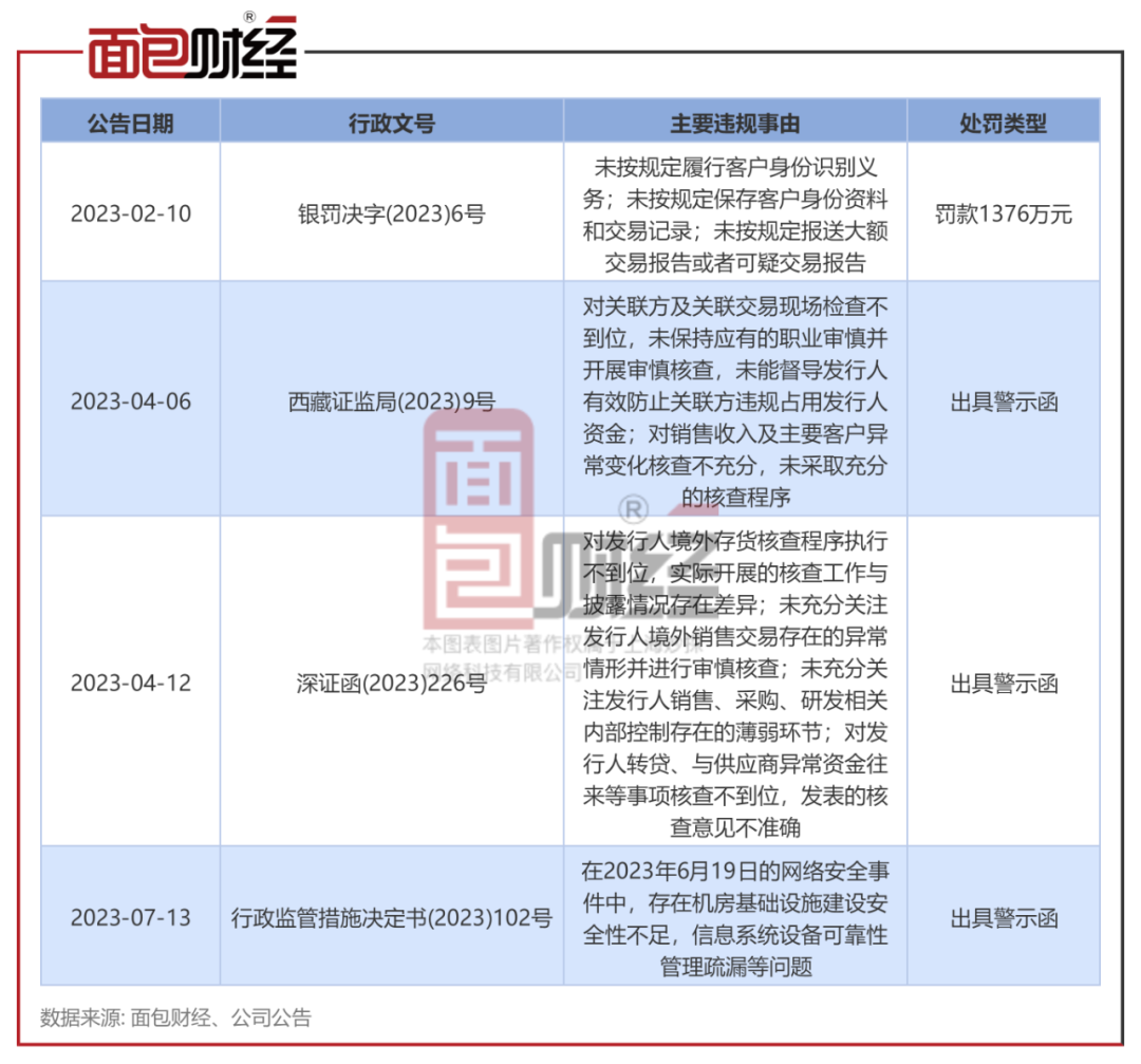 面包财经研究员梳理发现,截至2023年9月12日,今年以来,中信证券已被证监会分局、中国人民分支行等开出4张罚单,其中涉及一张千万级罚单,处罚金额高达1376万元。