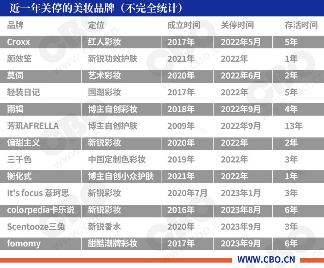 不止Scentooze三兔,据CBO不完全统计,近一年来,已有13家国货品牌宣布关停,平均每月就有一家国货品牌倒闭。It’s focus薏珂思、colorpedia卡乐说、Fomomy浮气等品牌在今年接连关停。