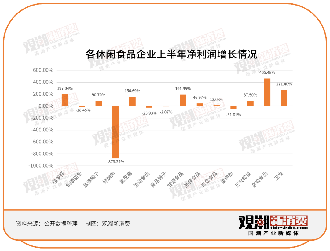 比如甘源食品,上半年实现营收8.26亿元,同比增长34.57%;归母净利润1.2亿元,同比增长190.92%。