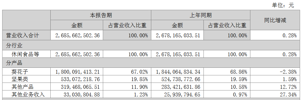 2023年上半年,洽洽的葵花子业务营收达18亿元,和2022年同期相比小幅下降了2.48%,成本相较2022年同期则上涨了8.25%,致使瓜子毛利率下降了7.46%。