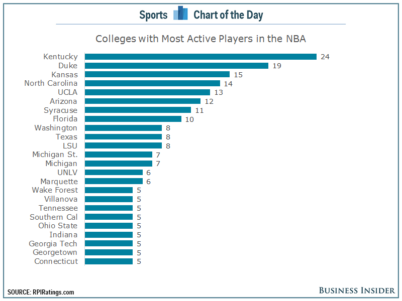 除此之外,作为老牌篮球名校的杜克大学则稍显逊色,与堪萨斯大学分列第二第三名。目前共有19名现役球员来自杜克,包括骑士三巨头之一的欧文(Kyrie Irving)以及效力于快船的奥斯汀·里弗斯(Austin Rivers)。