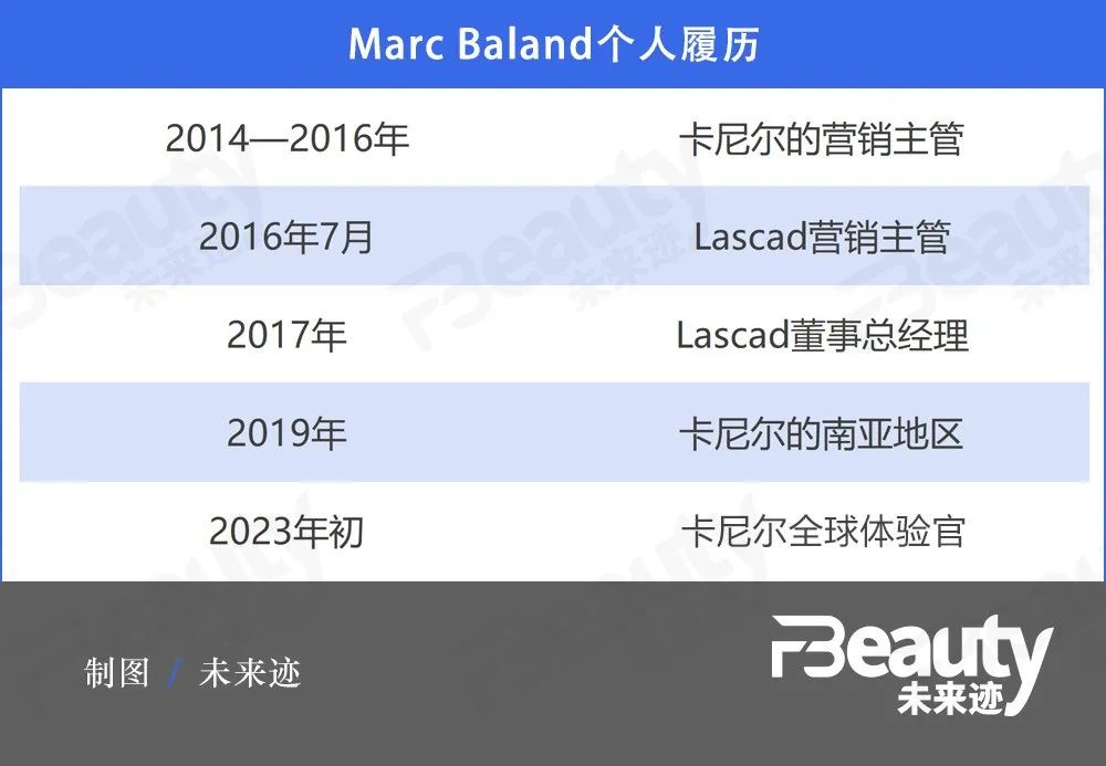 公开资料显示,Marc Baland于2007年加入欧莱雅集团。在此之前,曾担任耐克、Gap的商店经理。2007年,Baland成为欧莱雅旗下大众市场分销公司Lascad的营销项目经理。其后他深度参与了卡尼尔营销与品牌发展。
