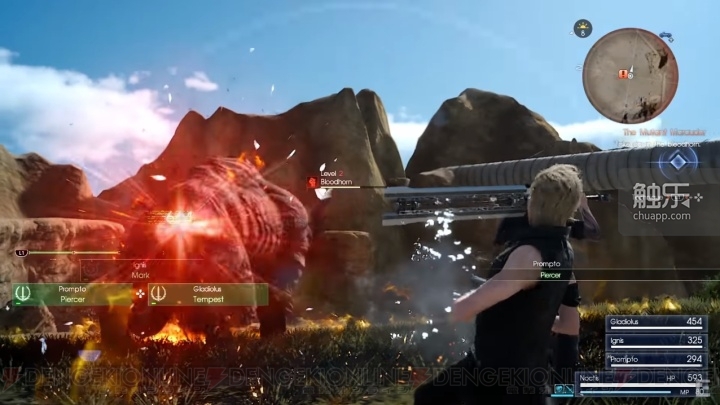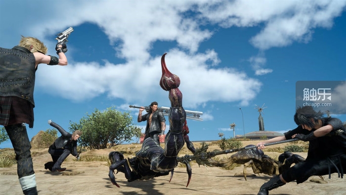 而且,这次的《最终幻想15》,参考魂系列的设计方针,彻底抛弃了回合制RPG标志性的“指令菜单”,一切行动均通过实时动作性操作进行:攻击和闪避都是指令操作,但也有按住攻击就是持续攻击,按住防御就是持续闪避之类的方便操作,准确地按下防御和攻击键也有相应的技能来提高攻击和闪避的效果;同样,按住R1也有锁定效果。游戏的基本招式克制也是非常日本动作游戏式的:玩家有攻击和闪避两种技能,而怪物则有攻击、投技(对闪避必中)和大招三种攻击形式,玩家可以用攻击技能对抗投技,也可以利用反击对抗怪物的大招。截止到这里,都还算是标准动作游戏的操作逻辑,但再往前就有大量全新的独特设计了——比如高速移动、魔法和队友技能。加入了这几个新的设计后,《最终幻想15》成功地提出了一个新的设计方案,在一个几乎是完整的动作游戏中实现了队友和策略选择。