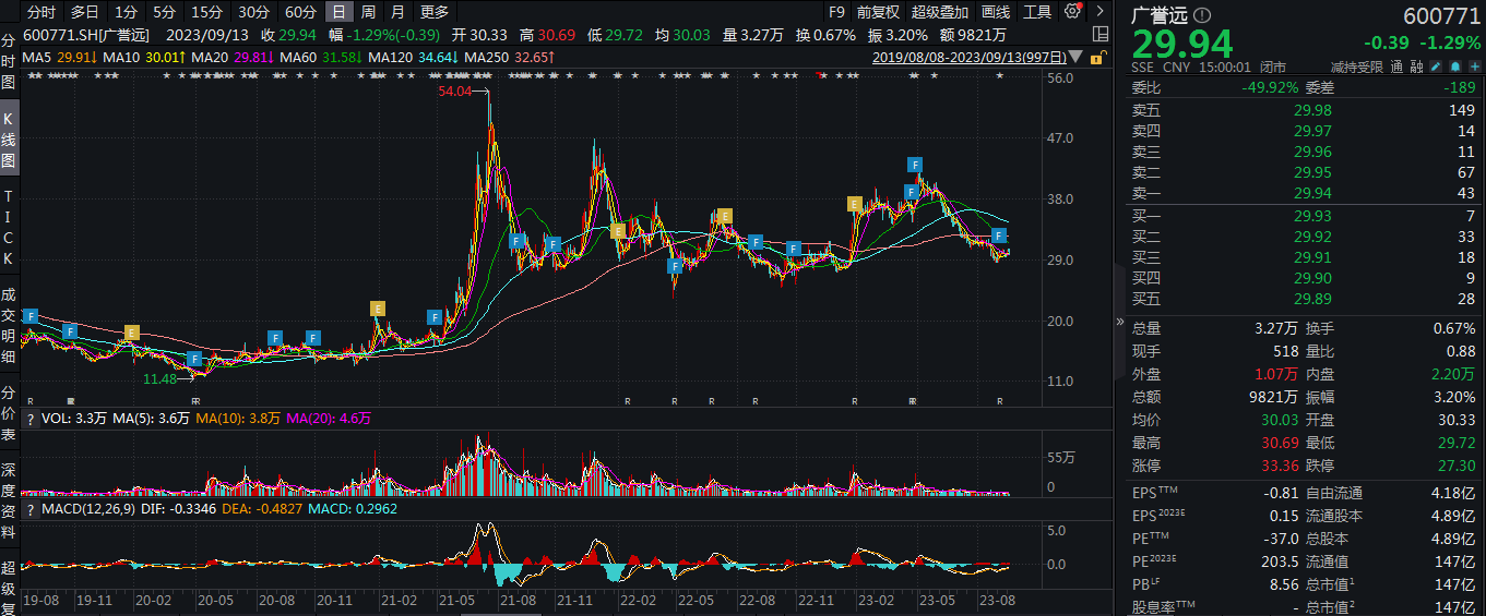 截止2023年9月13日,广誉远报收于29.94元/股,较近期高点已下挫31.95%,PE为203.5倍,市值为147亿元。