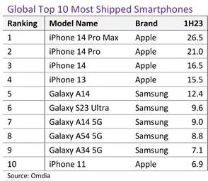 具体数据显示,iPhone 14 Pro Max、iPhone 14 Pro和iPhone 14位列于榜单的前三,2023年上半年的出货量分别为2650万部、2100万部和1650万部。第四名依然是苹果,只不过机型是iPhone 13,出货量为1550万部。