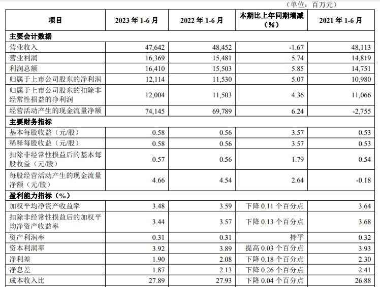 首先我们看华夏银行2023上半年的营收数字,476.42亿元,很遗憾2022年同期为484.52亿元,同比小幅下滑1.67%。