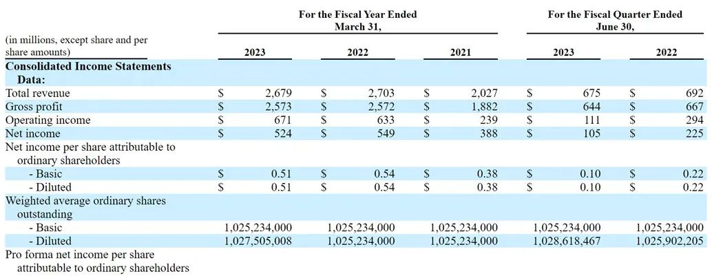 因为ARM的商业本质,是一家提供技术和服务的轻资产公司。ARM的收入来自两个方面:一是将芯片设计方案,即知识产权转让给苹果、三星、高通等芯片公司,收取一次性费用;二是芯片公司通过ARM IP实现芯片量产并销售给手机品牌后,再根据每颗芯片售价按比例向Arm缴纳版税。这种商业模式也为ARM带来极高的毛利润,2021财年、2022财年、2023财年,ARM的毛利率分别高达93%、95%、95.4%。