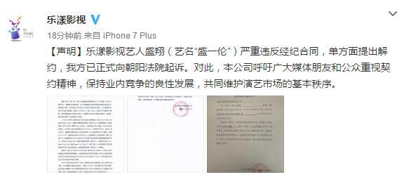 该报道发出后,乐漾影视文化公司的官方微博就此事作出回应:“乐漾影视艺人盛翔(艺名“盛一伦”)严重违反经纪合同,单方面提出解约,我方已正式向朝阳法院起诉。对此,本公司呼吁广大媒体朋友和公众重视契约精神,保持业内竞争的良性发展,共同维护演艺市场的基本秩序。”