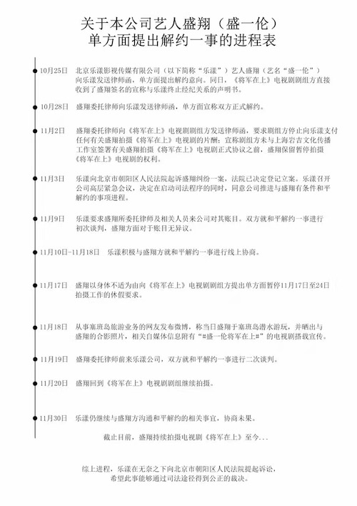 此后,乐漾影视文化公司再次披露了这场经济纠纷案的更多细节。由此可知,盛一伦与其经纪公司的经济纠纷已经持续一个月之久,10月25日,盛一伦曾委托律师致函乐漾影视公司,要求该公司在10月28日前支付拖欠的片酬,要求公司就未经其本人同意安排拍摄工作并更换经纪人等事项向其致歉,并表示上述要求不能满足将解除双方经纪合同。