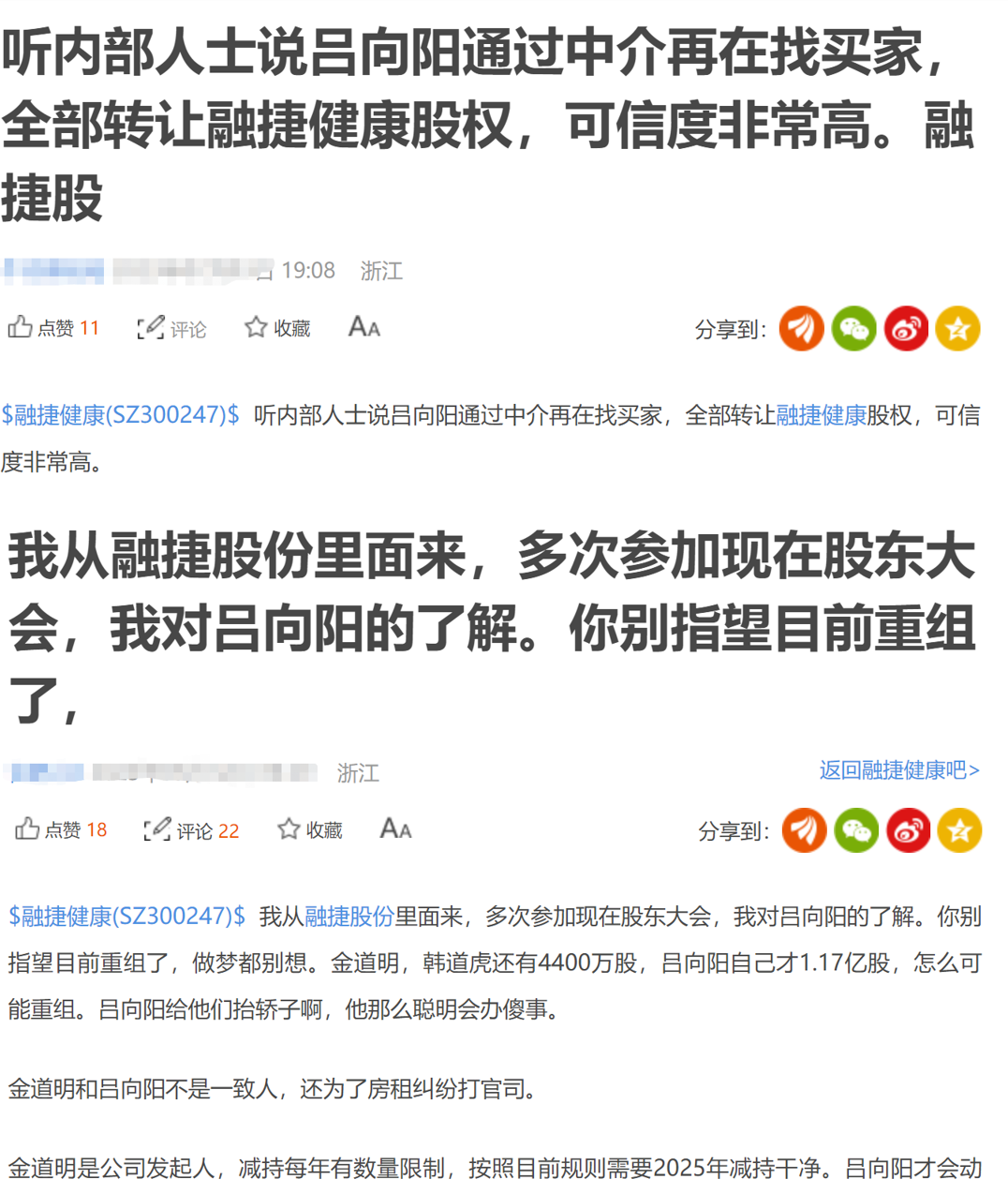 但吕向阳的这一举动还是引发了部分投资者的猜想。实际上,早在7月初就曾有投资者在股吧中称,吕向阳在通过中介为融捷健康找买家,试图卖壳,但谈了几次都没成功。也有自称参加过多次股东大会的投资者认为,目前融捷健康的原始股东还有持股,在他们完全退出前,吕向阳是不会启动重组的。