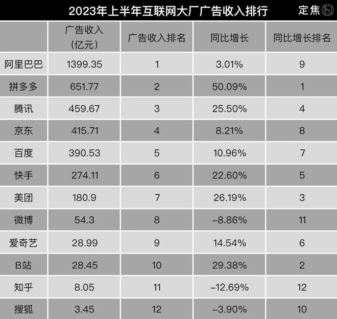 虽然传统电商的广告收入份额稳定,但整体增速已经放缓,以阿里巴巴为例,其今年上半年的广告业务增速仅有3%,排在倒数第四位。