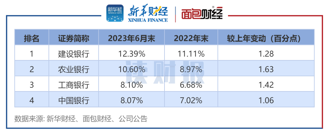 财报数据显示,截至2023年6月末,建设银行的普惠型小微企业贷款在总贷款占比最高,为12.39%;其次是农业银行、工商银行和中国银行,占比分别为10.6%、8.1%和8.07%。