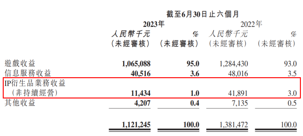 创梦天地收入来源中的“IP衍生品业务”分部主要提供游戏主机体验和零售、游戏及文化IP主题的潮流产品销售。在创梦天地上半年共计11亿元的收入中,来自“IP衍生品业务”的收入仅为1143.4万元(去年同期为4189.1万元),占总营收的0.4%,这是非持续经营下的收入数据。
