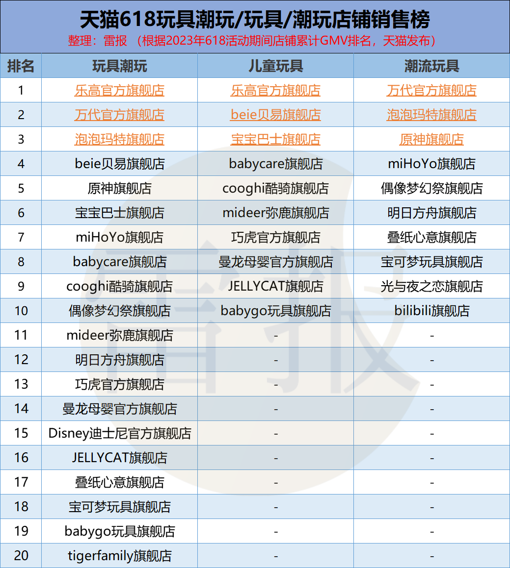 市面上还有一些游戏公司近年在衍生品业务方面表现颇为亮眼。对此,雷报整理统计了今年天猫发布的天猫618玩具潮玩、儿童玩具、潮流玩具三大类别的店铺销售榜,并重点关注其中涉及的游戏品牌的销售情况。
