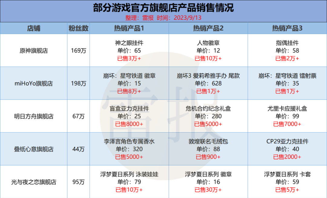 具体来看,榜单内部分游戏官方店铺中,游戏衍生品近期的销量方面,部分衍生品单款销量可达10万+,最高售出30万+。