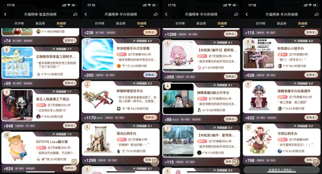 最新数据显示,“天猫榜单·手办热销榜”上,前15名中就有9款手办来自游戏IP,包括“原神”、“崩坏3”、“崩坏:星穹铁道”、“明日方舟”等,另外,被泡泡玛特、52TOYS、TOPTOY等头部潮玩品牌产品霸榜的“盲盒热销榜”上,游戏IP“第五人格”官方旗舰店的“真理之下主题盲盒”产品也跻身第9位。