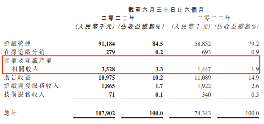 按业务板块细分来看,2023年上半年,飞鱼科技“授权及知识产权”相关收入为352.8万元,同比增长143.8%,占公司总营收的3.3%(去年同期占比仅1.9%),但相比占到总收入84.6%的“游戏营运”板块,IP衍生相关收入只能算“锦上添花”,对公司业绩并没有特别显著的影响。