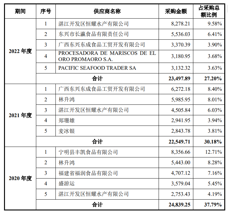 2022年3月,证监会就在反馈意见中称,鲜美来的供应商较为分散,原材料采购中最主要的原料是冰鲜虾和冻鲜虾仁,而鲜美来冰鲜虾的主要供应商为个人或个体户,并要求鲜美来补充报告期内主要原材料供应商、委托加工、生产供应商的基本情况。