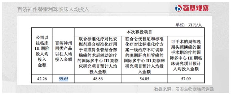 如下图所示,君实生物曾在问询函回复公告中测算,百济神州人均临床费用接近60万元。