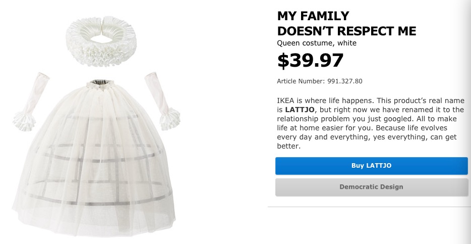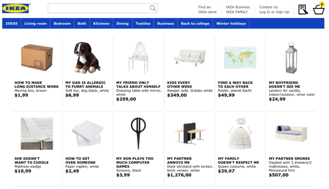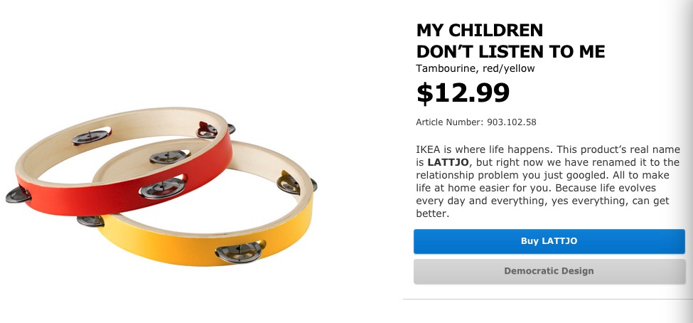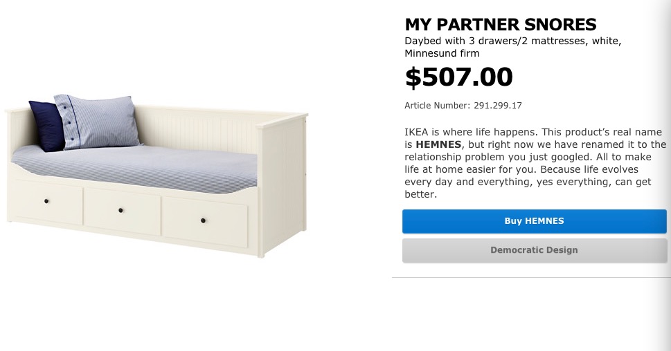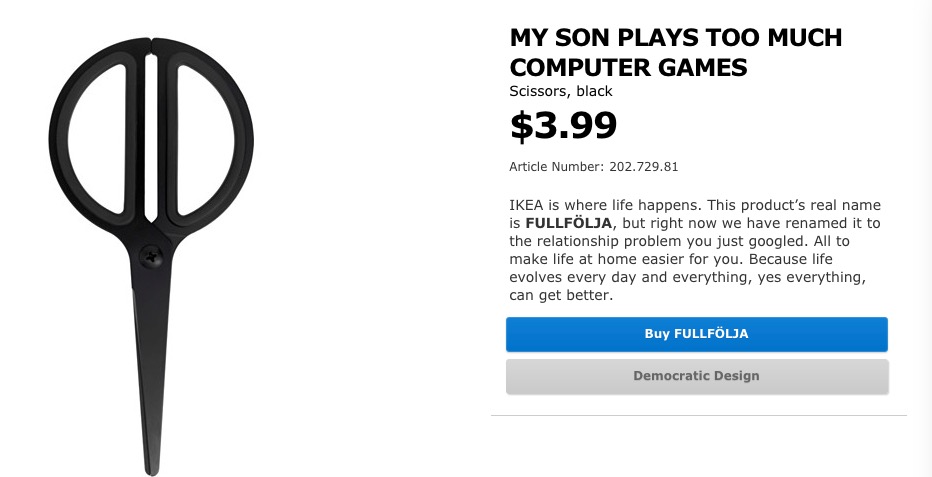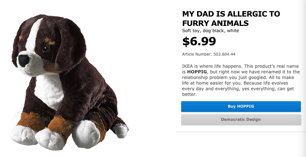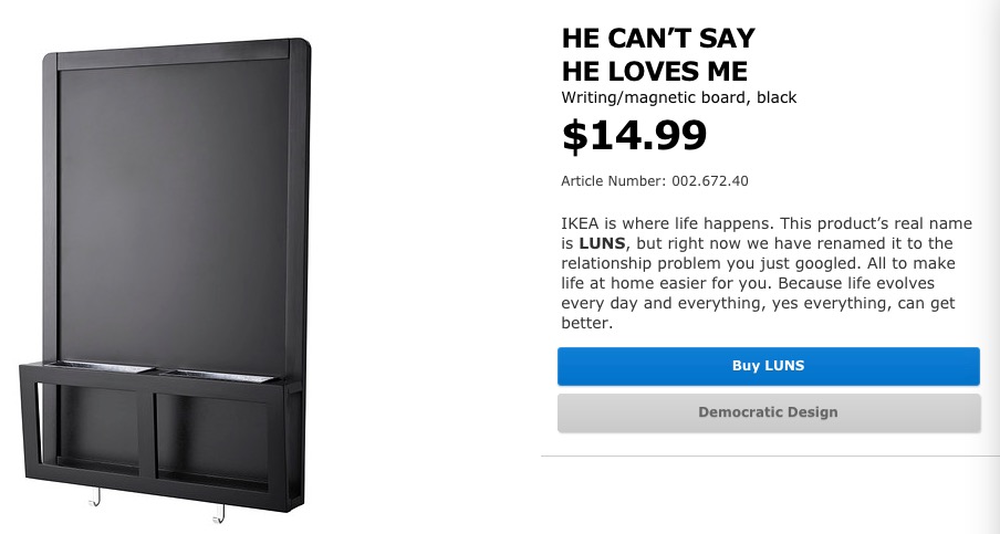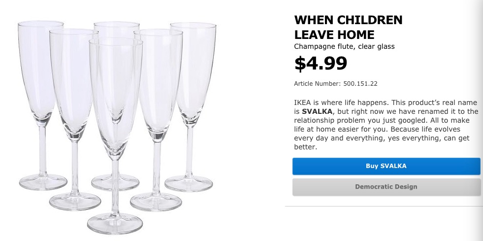 宜家和瑞典广告公司Åkestam Holst合作,在它的英文网站上,发起了一场“购物治疗法”的营销——100多个产品的名字,被改成了“段子”。