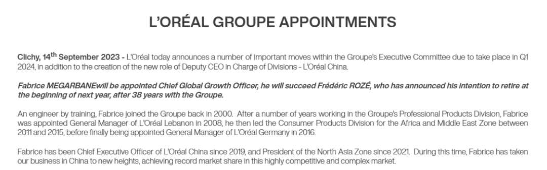 现任中国区“一把手”费博瑞Fabrice Megarbane升任集团首席增长官,接替要退休的Frédéric ROZé。据悉,为了确保顺利过渡,费博瑞Fabrice Megarbane将保留他目前的职责,直到2024年1月底。