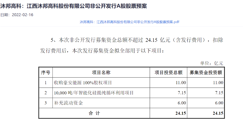 9月14日,沐邦高科(603398.SH)再次更新定增公告。公告显示,沐邦高科计划定增不超17.06亿元,分别投向去年收购的豪安能源、1万吨/年智能化硅提纯循环利用项目和补充流动资金。