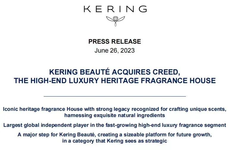 无独有偶,今年6月,开云美妆收购高端小众香水Creed品牌100%的股份,据路透社报道,具体交易金额可能高达20亿欧元(约合人民币156.54亿元)。此次收购,被业界视为开云集团正式独立进军全球美妆市场的首个战略性动作。