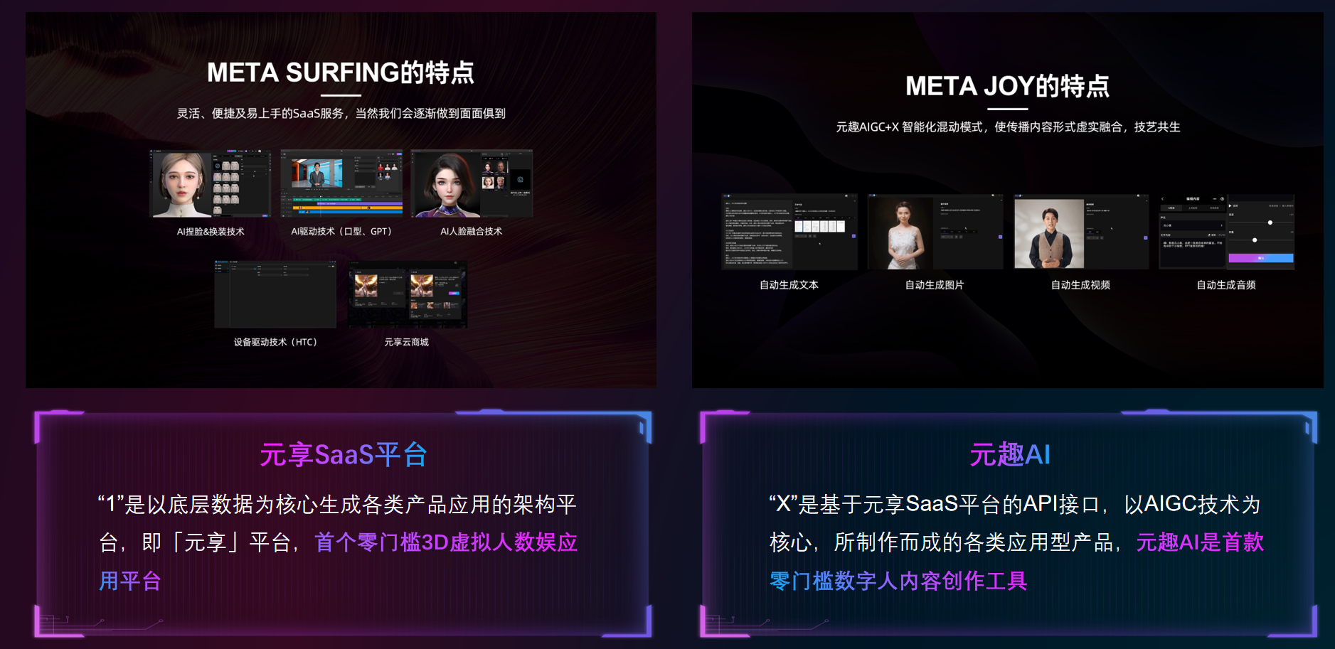 CG数字人到AI数字人是一个行业大演化趋势,平台化智能生产虚拟数字人,才有望降低数字人成本。元境科技为此开发了元享SaaS平台和元趣AI两个平台,结合AI能力,为用户提供低成本的创作能力。前者可以随意搭配眼睛、嘴型等合成数字人,表情也有大模型算法支持。后者则支持生成图,文生视频,文生声音,将内容生产过程全部AI化。”相当于没有技术基础的普通人,也可以生产属于自己的数字人。