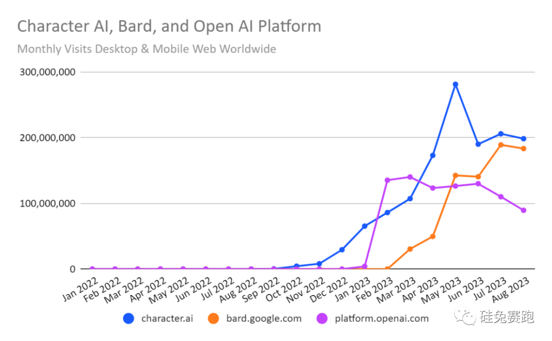 最近根据市场情报机构 Similarweb 的分析,Character.AI应用在美国的月活用户为420万,直逼ChatGPT的移动应用在美国的月活跃用户数(近600万)。在网络端,ChatGPT的活跃用户数量仍大幅领先。