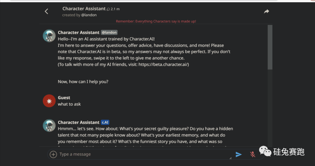 在体验中,Character助手在解决如 “保持健康、规律作息、饮食文化”等生活建议类问题的能力上,和ChatGPT相差无几;但是因为 "角色说的一切都是虚构的”,在讨论事实性问题的时候,如“Character.AI用了什么模型?”、“Character助手和ChatGPT存在什么区别?”这些时,这个助手就开始了它的“添油加醋”。