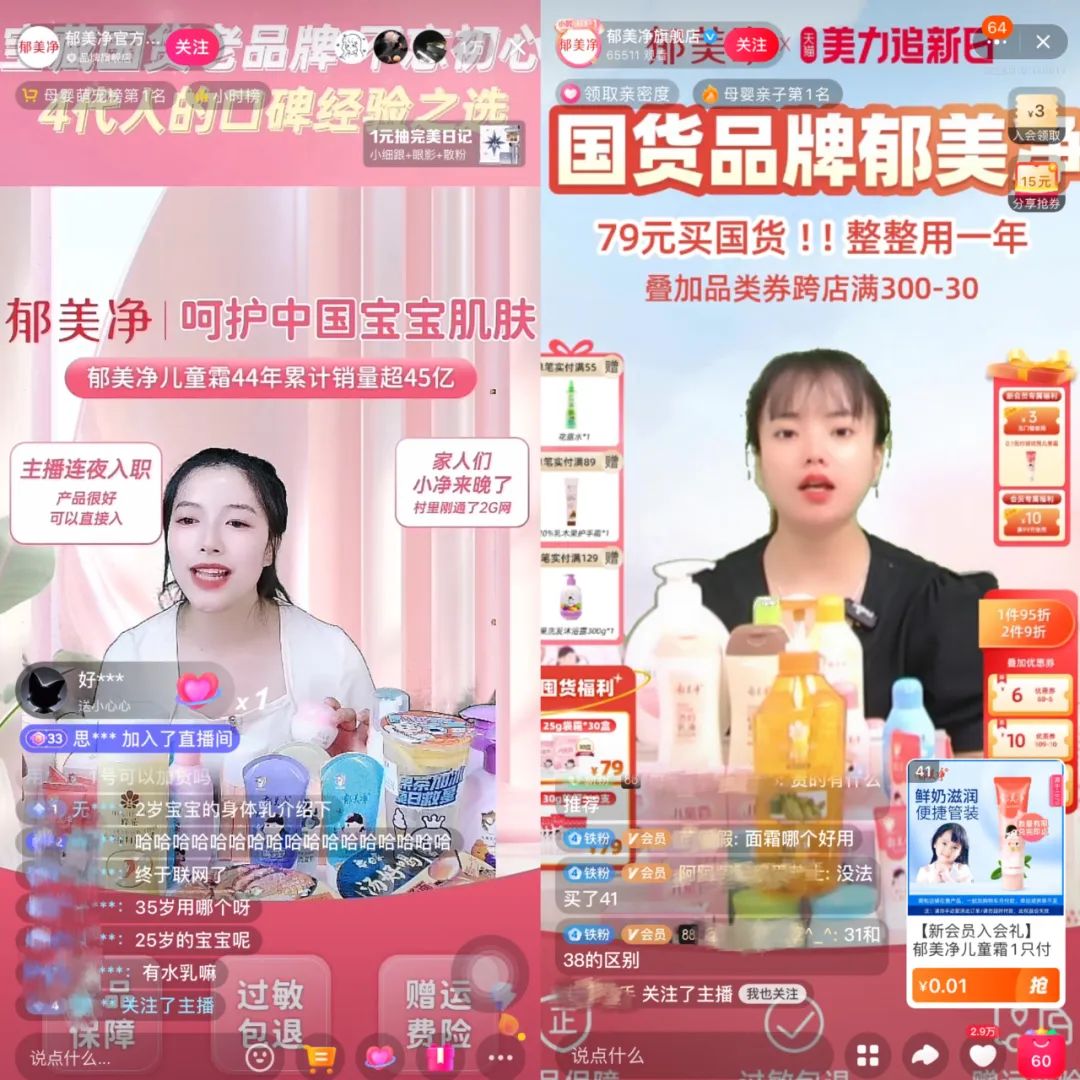 9月14日,郁美净官宣,全面入驻各大平台,抖音、小红书账号启用,连夜开店上链接。当晚,郁美净开启了首场抖音直播,背景字幕“国货不贵,79元囤一年”。