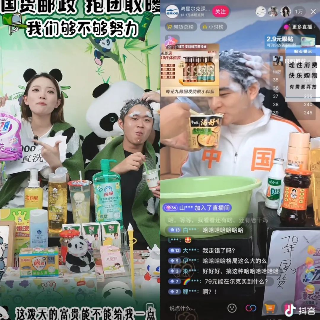 老牌护肤品牌郁美净“连夜通网”,注册各大平台直播账号,匆匆上链接开张,开播一天后涨粉近百万;被传倒闭的老国货品牌活力28商品被抢光后,仍有8万人冲进没挂小黄车的直播间;鸿星尔克的直播间找来白象泡面、蜜雪冰城、汇源果汁等国货品牌“梦幻联动”,边卖鞋边用蜂花洗发水洗头,一场直播卖了500万……