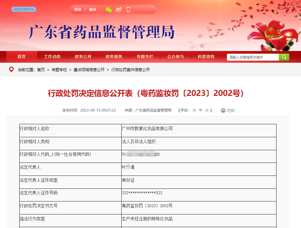 9月15日,据广东省药品监督管理局(下称“广东药监局”)官网消息,广州市敦复化妆品有限公司(下称“广州敦复”)因生产未经注册的特殊化妆品,被开出10年禁业罚单;同时,该企业法定代表人和直接负责的主管人员也被终身禁业。