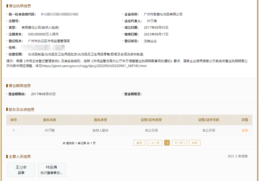 青眼在国家企业信用信息系统中查询发现,叶*清作为法定代表人,同时还任广州敦复执行董事兼总经理、大股东、实际控制人和受益所有人,100%持股广州敦复;而王*会的职务是监事,但未持股广州敦复。