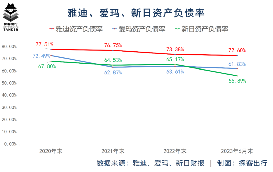 此外,雅迪的资产负债率依然偏高。公开信息显示,2020年末至2023年6月末,雅迪的资产负债率分别为77.51%、76.75%、73.38%和72.60%,既高于同期末爱玛的资产负债率(72.49%、62.87%、63.61%、61.83%),也高于同期末新日的资产负债率(67.80%、64.53%、65.17%、55.89%)。