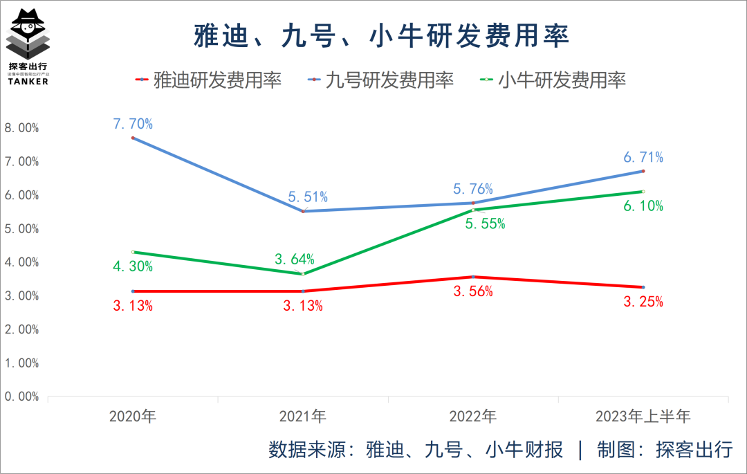 从产品来看,「探客出行」通过梳理雅迪、九号公司、小牛电动等三家车企财报发现,2020年至2023年上半年雅迪的研发费用率分别为3.13%、3.13%、3.56%和3.25%。相比之下,同期九号的研发费用率分别为7.70%、5.51%、5.76%和6.71%;同期小牛的研发费用率分别为4.30%、3.64%、5.55%和6.10%。