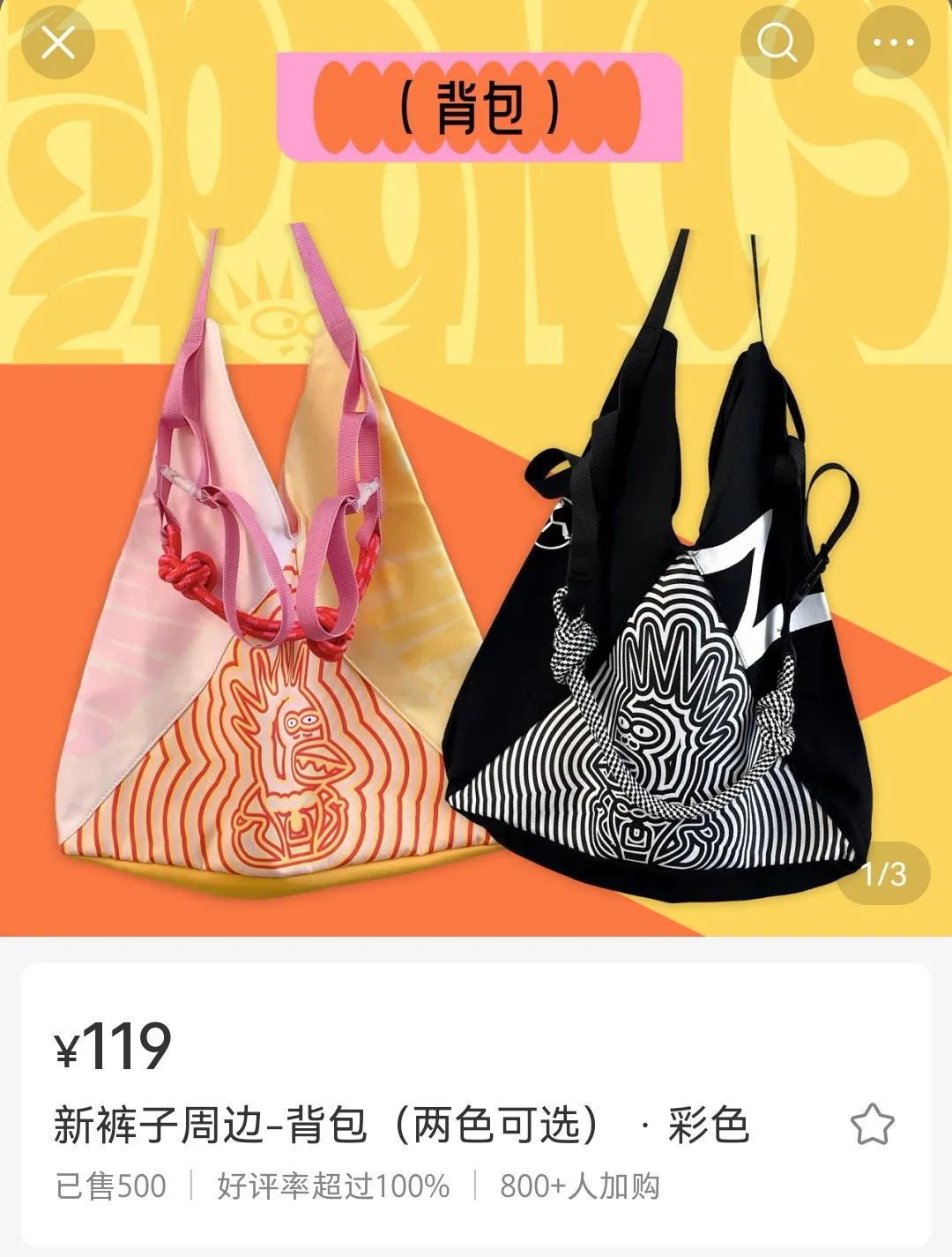 比如泡泡岛音乐节与香薰品牌刻气Kitsch(原刻奇)联名推出的火山形象相关周边便大受欢迎,不乏有年轻乐迷花费数千元在现场购买;而新裤子乐队在7月推出的定价119元的新款“咪咪与嘎嘎”帆布包也在上架小红书店铺后飞速售罄,用户晒单笔记中也大多为年轻大学生群体。