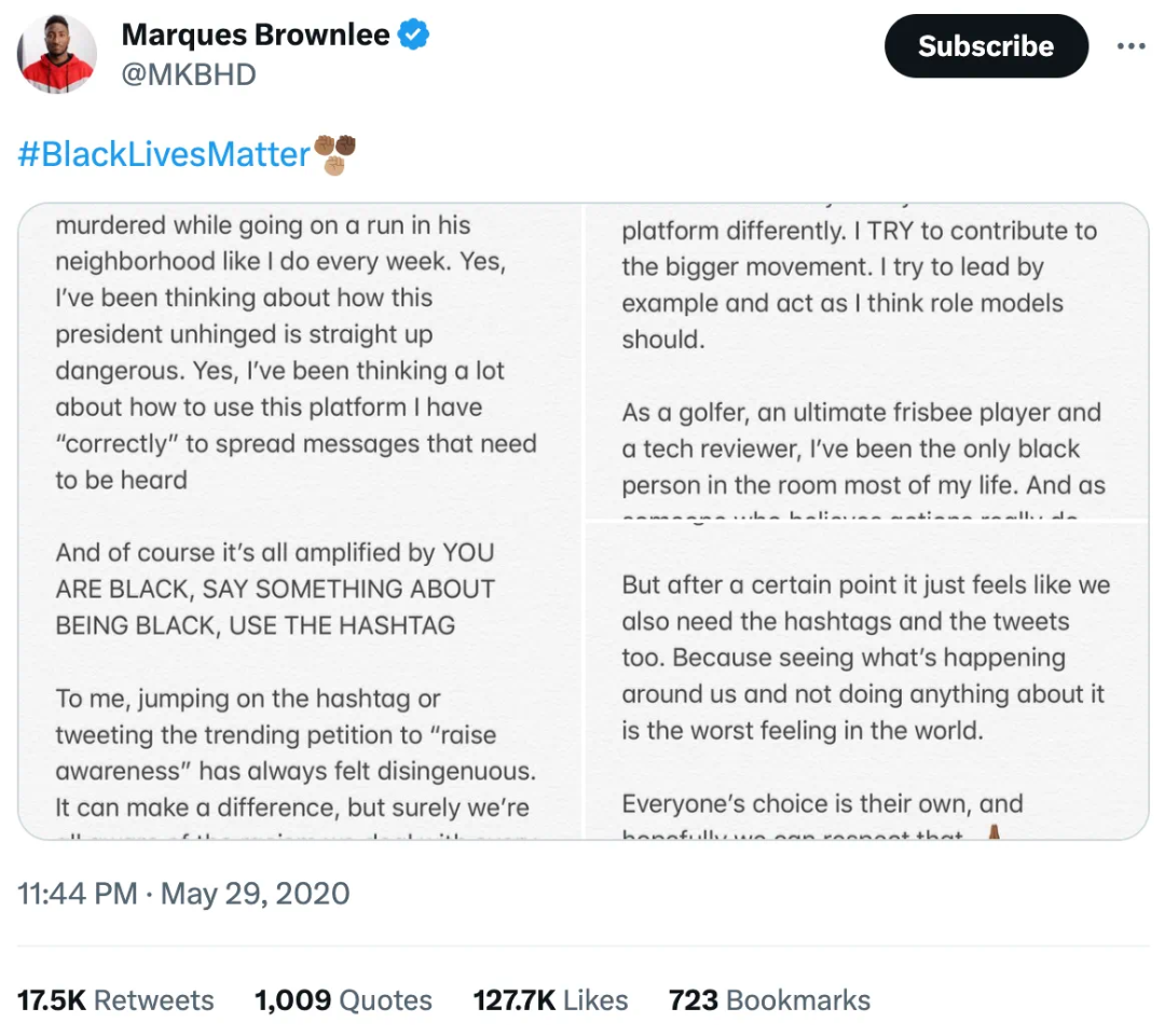 除去这些活泼有趣的回复,他在Twitter上回应BLM等热点社会问题时,则会呈现出更为逻辑清晰,富有理性的形象。