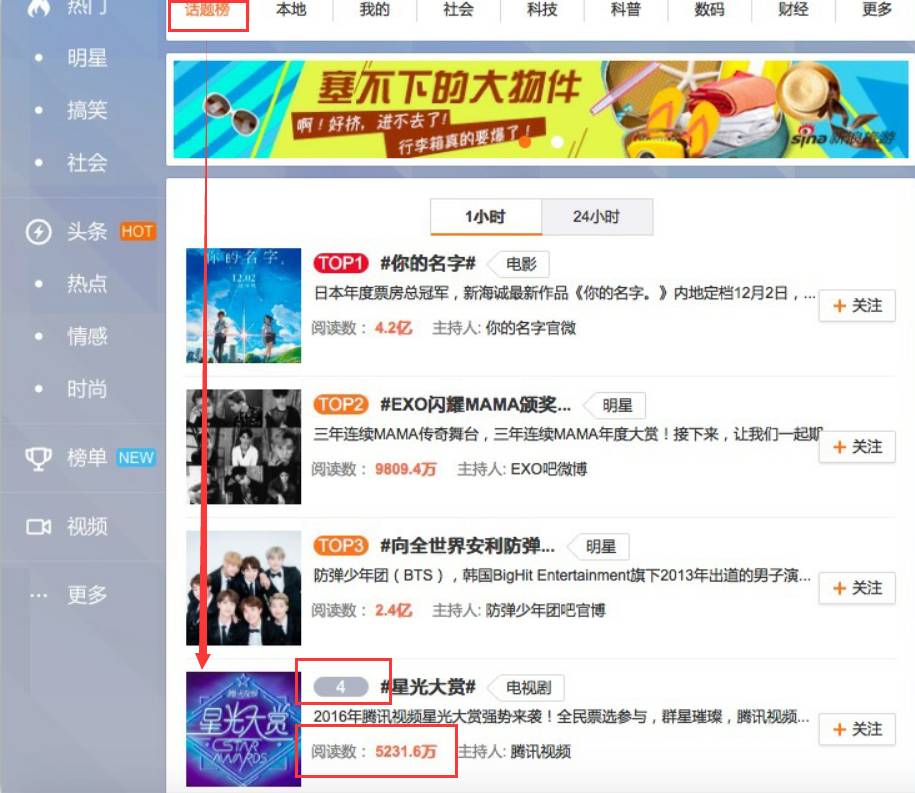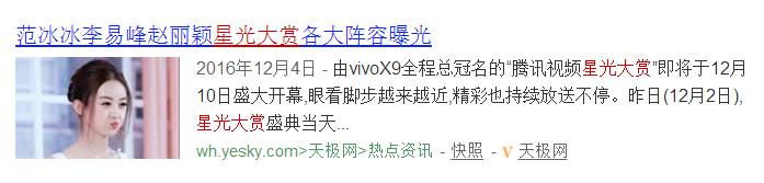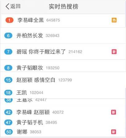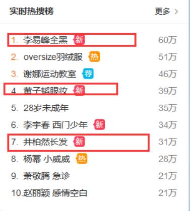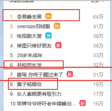 除了#李易峰全黑#,还有#黄子韬眼妆#,#井柏然长发#,#赵丽颖 感情空白#页纷纷登上热搜榜,这些话题都是跟《星光大赏》有着直接关系的。