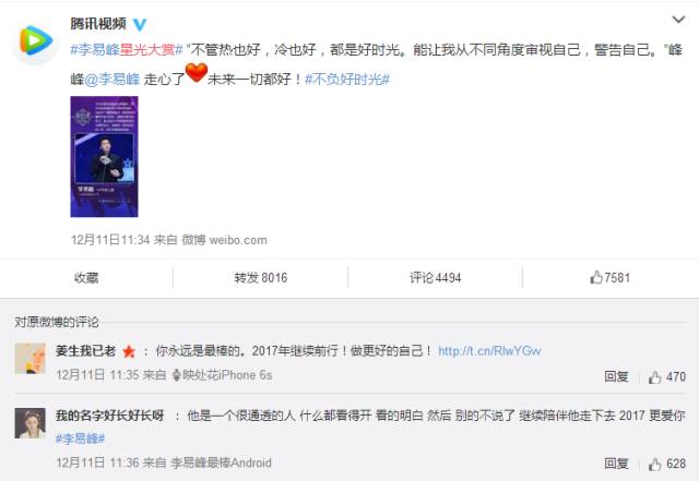腾讯视频官方微博的一条#李易峰星光大赏的微博,转发量、评论数、点赞数都超高,粉丝评论点赞数也成百上千: