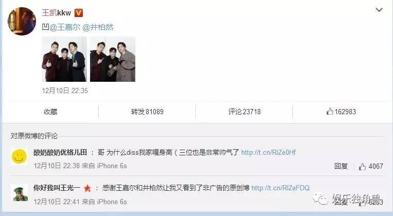 而王嘉尔当晚可能太激动了,第二天才想起来反击,告诉王凯不要这样黑自己,粉丝们还在评论里说王嘉尔反应有点慢;
