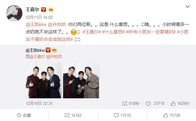 而王凯则沉浸在与好友的重聚当中,甚至还小小的“黑”了一下王嘉尔,兄弟情果然很浓厚;