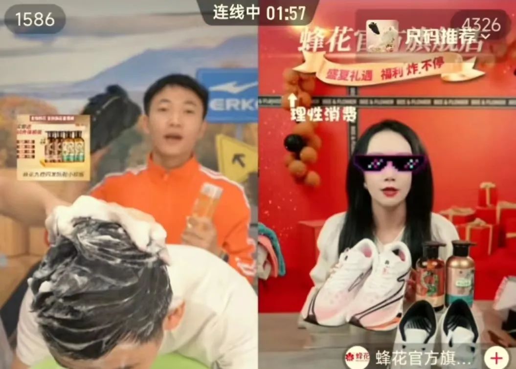 鸿星尔克和蜂花的主播在直播间展示对方品牌的产品。图 / 网络直播间
